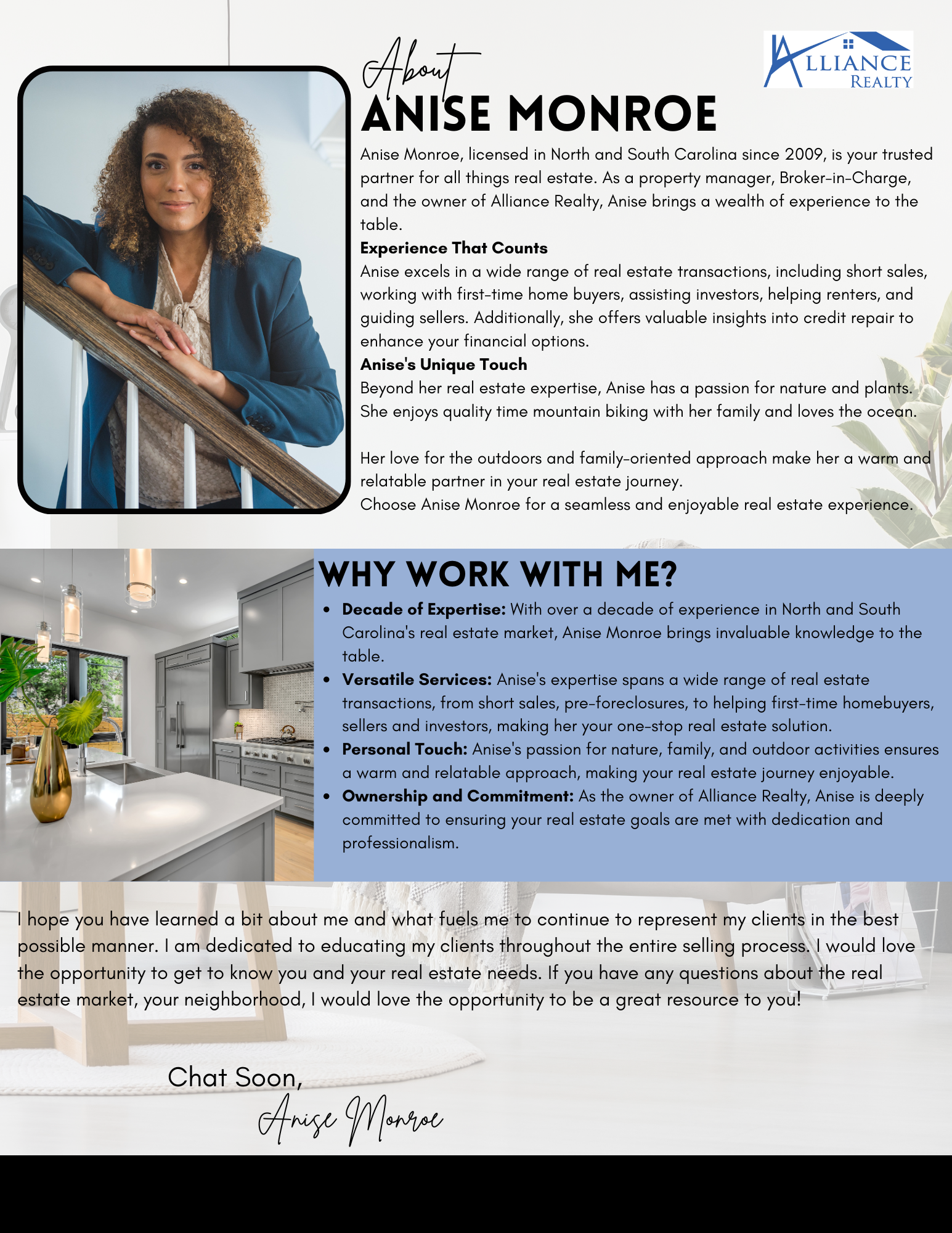 Anise Monroe, licensed in North and South Carolina since 2009, is your trusted partner for all things real estate. As a property manager, Broker-in-Charge, and the owner of Alliance Realty, Anise brings a wealth of experience to the table.